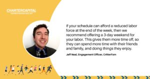 If your schedule can afford a reduced labor force at the end of the week, then we recommend offering a 3-day weekend for your labor. This gives them more time off, so they can spend more time with their friends and family, and doing things they enjoy.